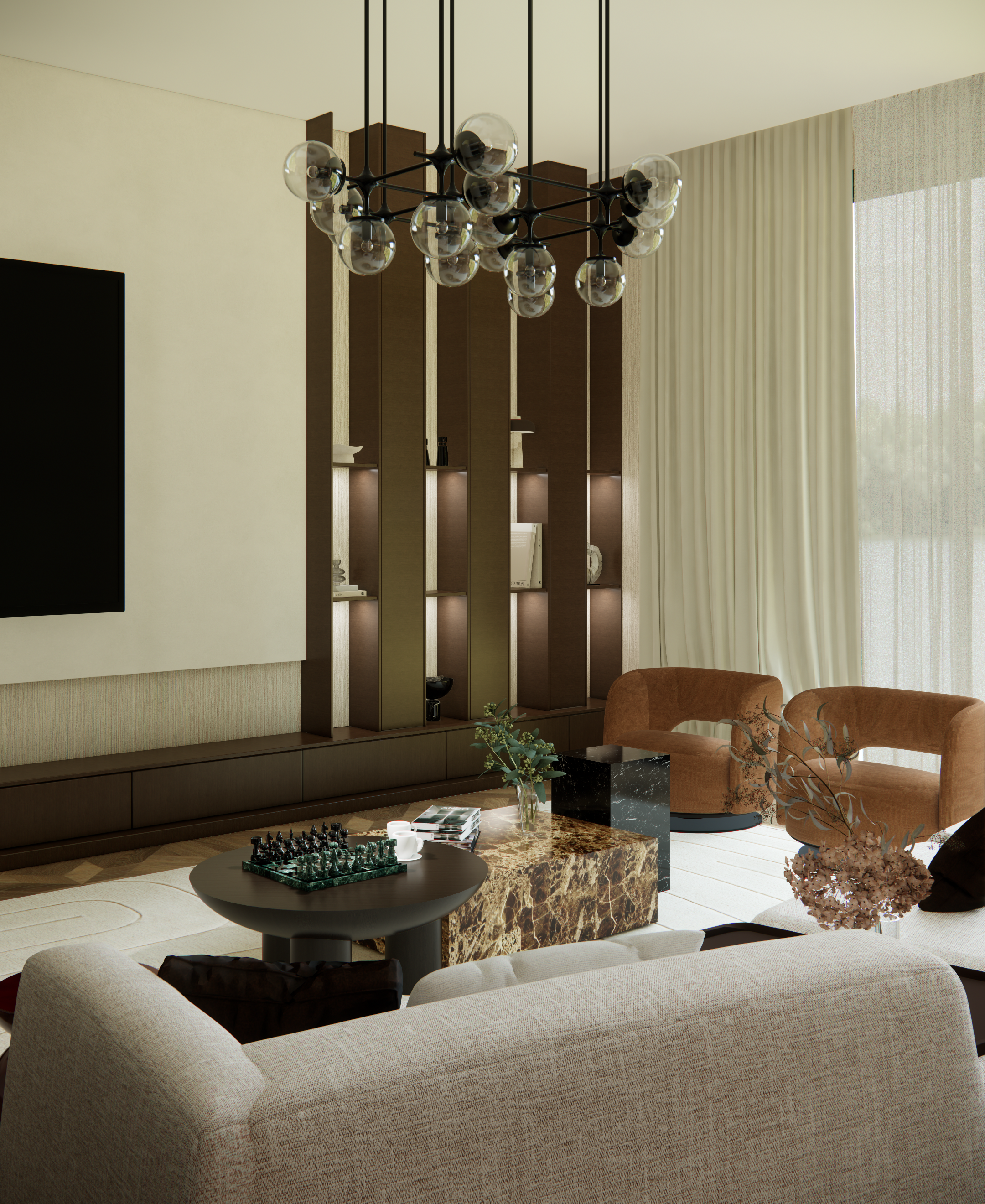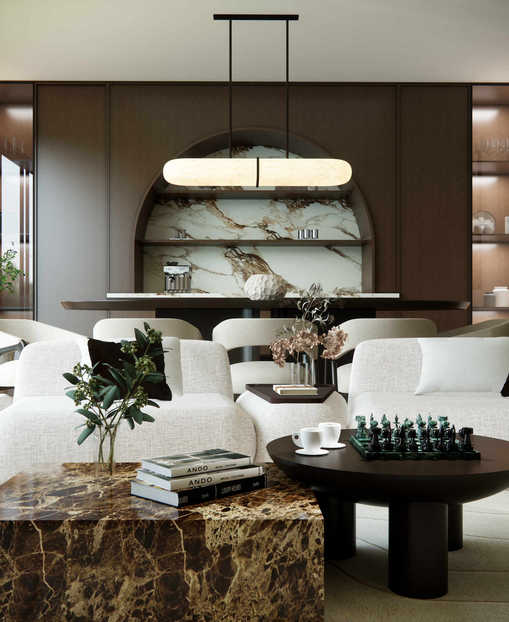 This project explores the interplay between rich natural materials and restrained form. Dark wood, veined marble, and softened upholstery are layered to create depth, while clean lines and controlled symmetry bring clarity to the space. The result is an environment that feels curated, cohesive, and enduring.